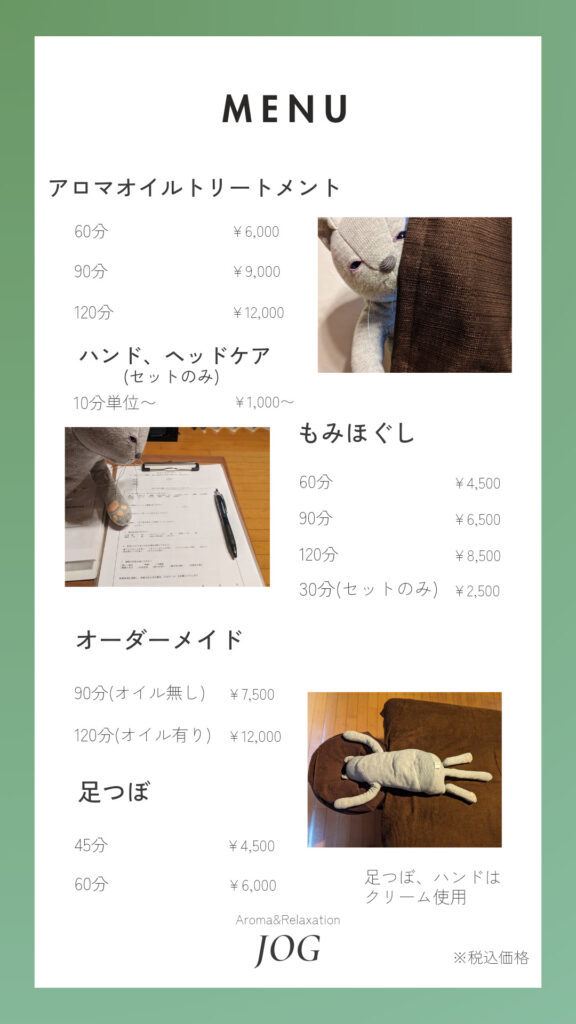 Aroma&Relaxation JOG 2024年1月〜料金改定のお知らせ